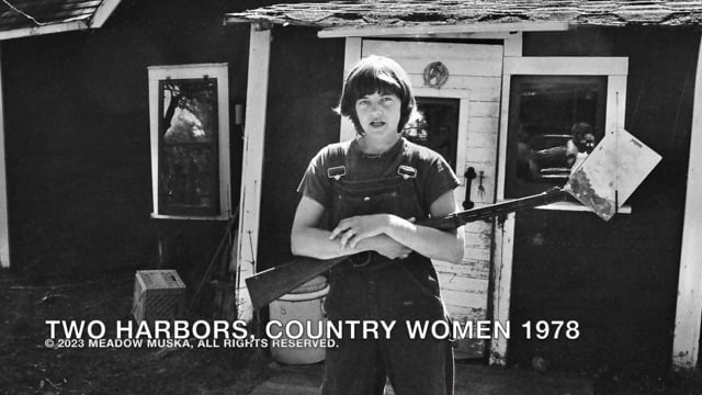 Two Harbors, Minnesota 1978. ©Meadow Muska. Moving from Aitkin Lesbian land to Two Harbors, Shirley Duke poses in front of a log cabin.