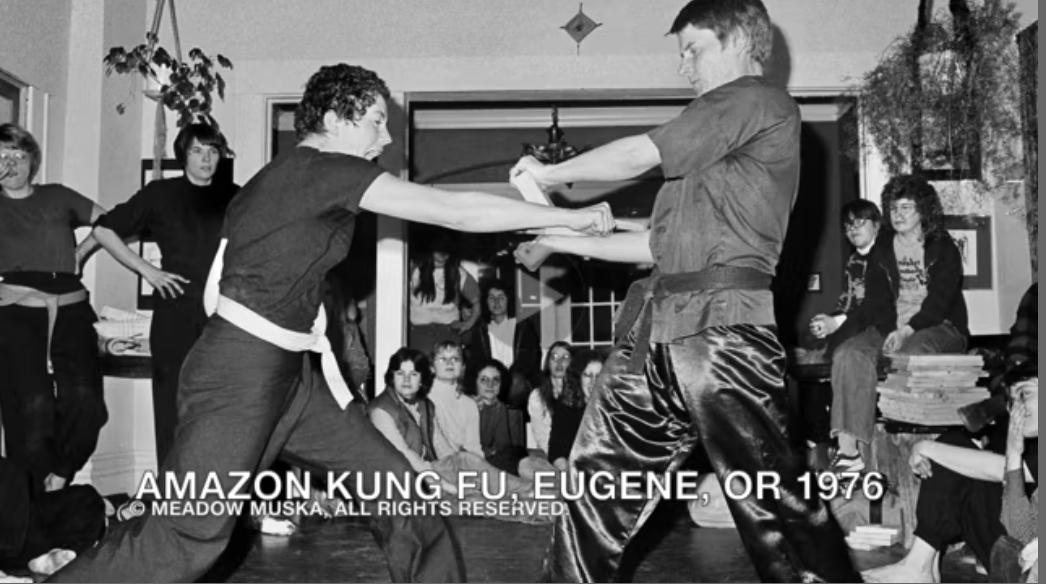 Colleen F. Gragen, also known as Crow, successfully punches through two boards while Barbara Bones braces for impact. Joyce Towne, another black belt instructor in Amazon Kung Fu, watches from behind Crow's left. This video demonstrates the supportive energy between the martial artists and the Eugene lesbian community during a demonstration at Gertrude's Silver Note Cafe. Gertrude's was a collective that operated a cafe and women's center, which opened in the fall of 1975 and closed in the spring of 1976. I adore the personalities showcased in the group slide series, as I continue to capture photographs.